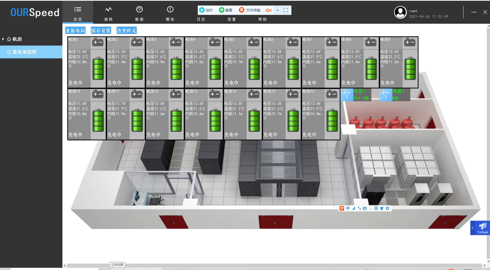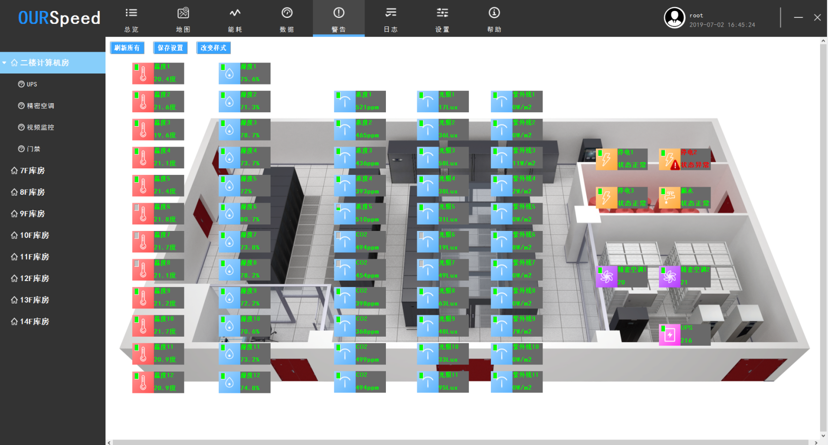 6.具有SMTP郵件報警功能,支持更安全SSL加密的郵件協議,能夠提供JSON格式北向接口,提供傳感器的多種界麵展示風格,比如汽車儀表樣式,數碼管風格樣式等。傳感器數據顯示樣式不少於4種,並且能實時切換各種顯示樣式,傳感器可隨時在係統拓撲圖上拖動,靈活的將傳感器展示在拓撲圖上指定位置,支持多種不同權限級別用戶登錄操作,支持BS端控製空調,實現聯動,可以直接接入視頻監控,實時查看,可進行大屏展示,也可遠程切換後台處理數據異常。