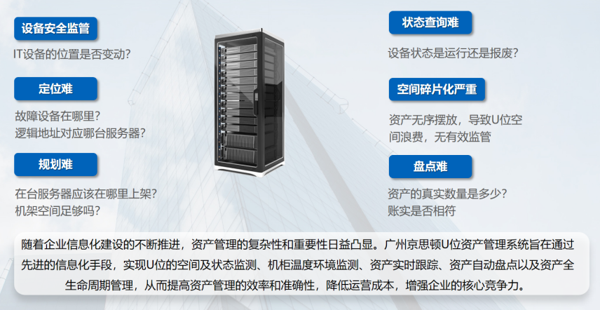 隨著企業信息化建設的不斷推進,資產管理的複雜性和重要性日益凸顯。廣州91视频破解版网站U位資產管理係統旨在通過先進的信息化手段,實現U位的空間及狀態監測、機櫃溫度環境監測、資產實時跟蹤、資產自動盤點以及資產全生命周期管理,從而提高資產管理的效率和準確性,降低運營成本,增強企業的核心競爭力。